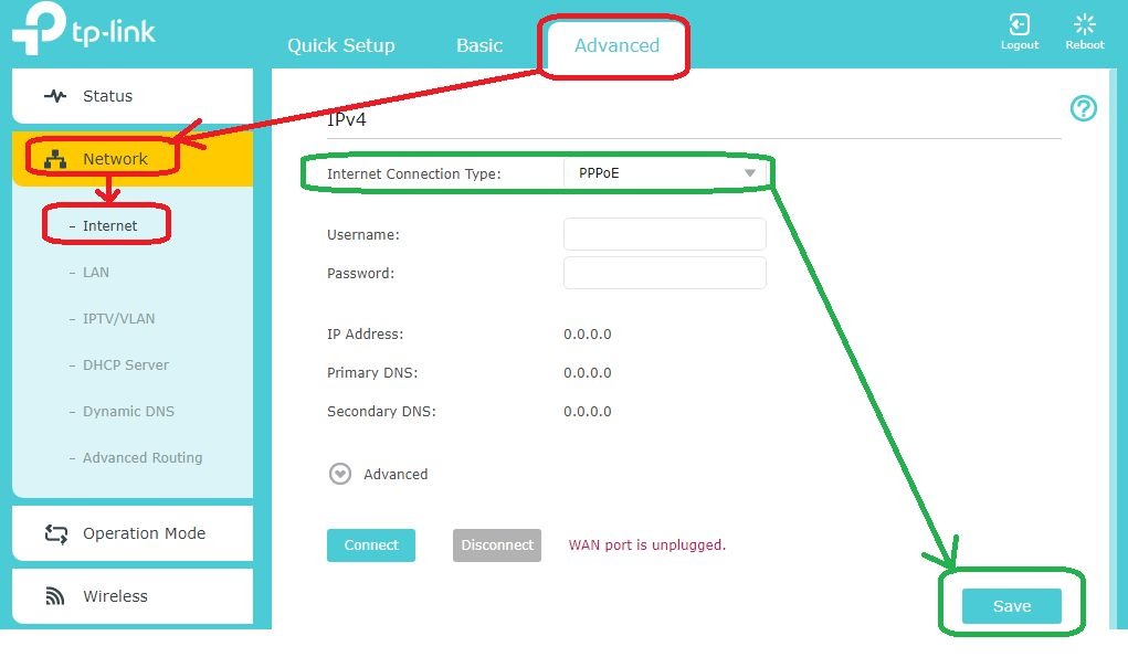 Internet. Nastavte položku Internet Connection Type na PPPoE a