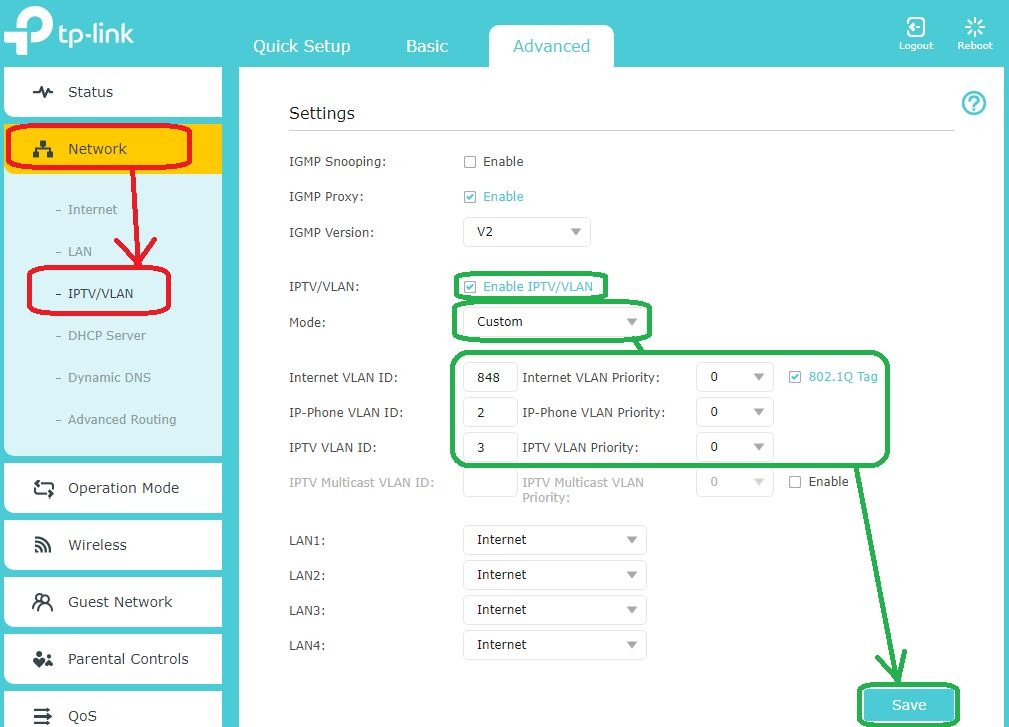 ○ Internet VLAN ID na 848 a zaškrtněte 802.1Q Tag